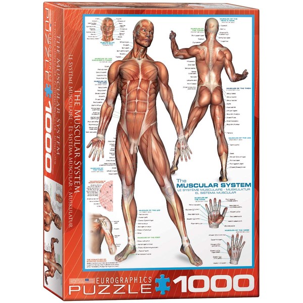 EuroGraphics Muscular System 1000-Piece Puzzle. Box size: 10" x 14" x 2.37". Finished Size: 19.25" x 26.5". Learn about the muscles of the human body. Features details of the head, the neck and the hand. Strong high-quality puzzle pieces. Made from recycled board and printed with vegetable based ink. This superior quality puzzle will delight and educate all at the same time.