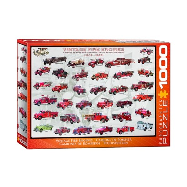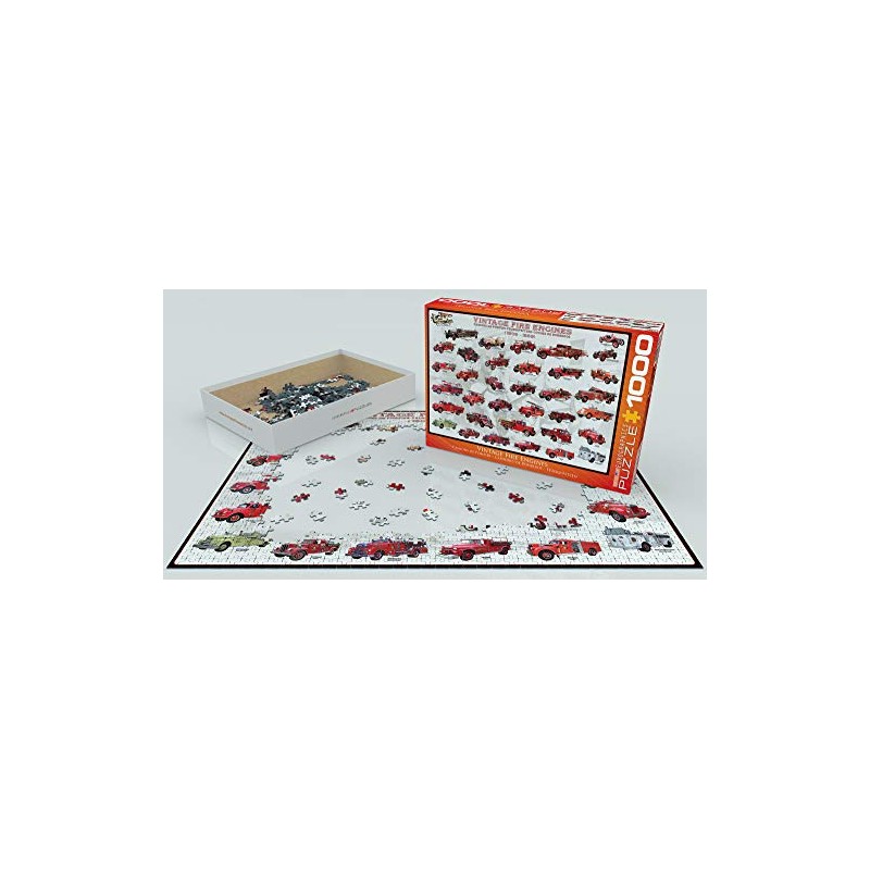 EuroGraphics Vintage Fire Engines 1000-Piece Puzzle. Box size: 10" x 14" x 2.37". Finished Size: 19.25" x 26.5". More than 35 antique fire engines are illustrated in this fascinating evolution of the fire engine throughout the years 1909-1959. Strong high-quality puzzle pieces. Made from recycled board and printed with vegetable based ink. This superior quality puzzle will delight and educate all at the same time.