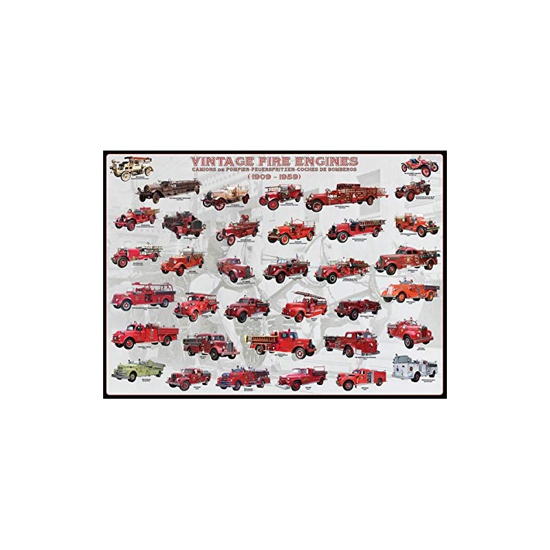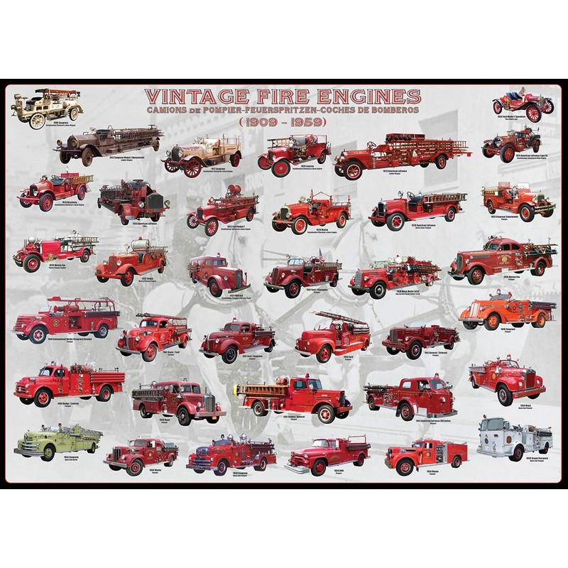 Vintage Fire Engines. 1000 piece puzzle. 26.5" x 19.25". More than 35 antique fire engines are illustrated in this fascinating evolution of the fire engine throuhout the years 19"09-19"59. This superior quality puzzle will delight and educate all at the same time. Strong high-quality pieces that won't break. Easy fit puzzle pieces. Made from recycled board.