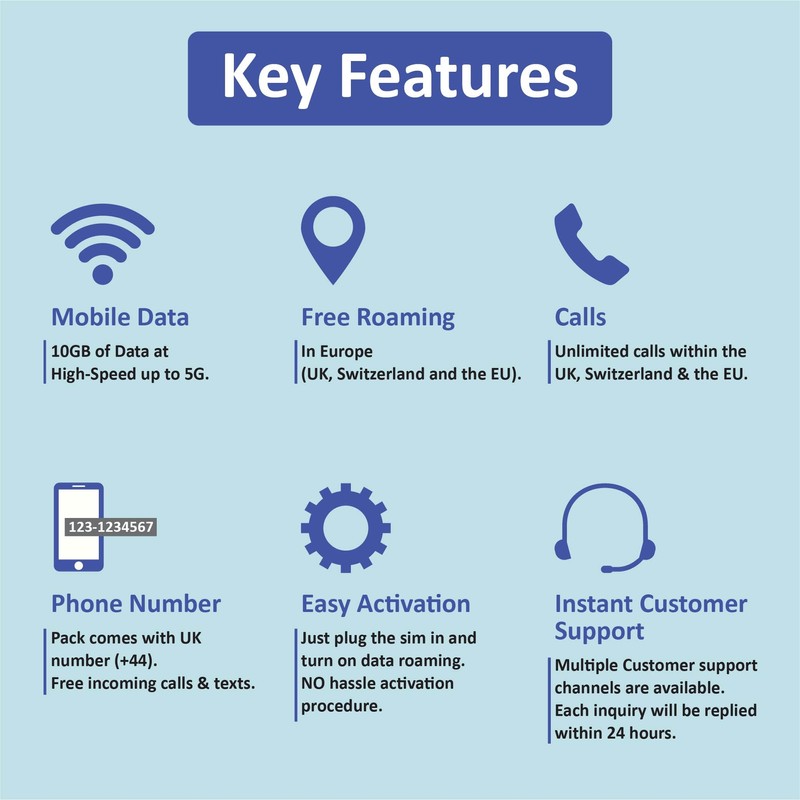 - Phone calls & SMS: Unlimited Calls & Texts within Europe. Pack comes with a UK number (+44).