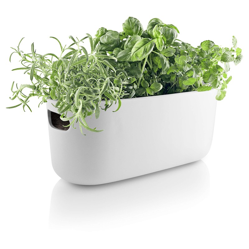 Grow your own herbs in the kitchen – and let them look after themselves. The herb organizer's self-watering system keeps your herbs fresh for several days at a time if necessary. The herb organizer provides optimum growing conditions as the herbs sit on a capillary mat which absorbs the water in the reservoir at the bottom of the pot and transports it to the plants. The water reservoir holds up to 500 ml of water, so all you have to do is to fill it regularly, and then you can rely on the pot to do the watering. The herb organizer has a convenient carrying handle at each end, so it’s easy to move around. It accommodates up to three standard-sized herbs in their own plastic pots. All parts, except the capillary mat, are dishwasher-safe. **Herbs Not Included**