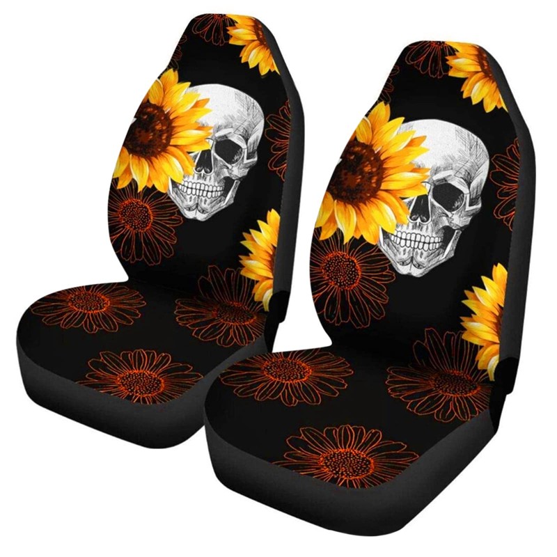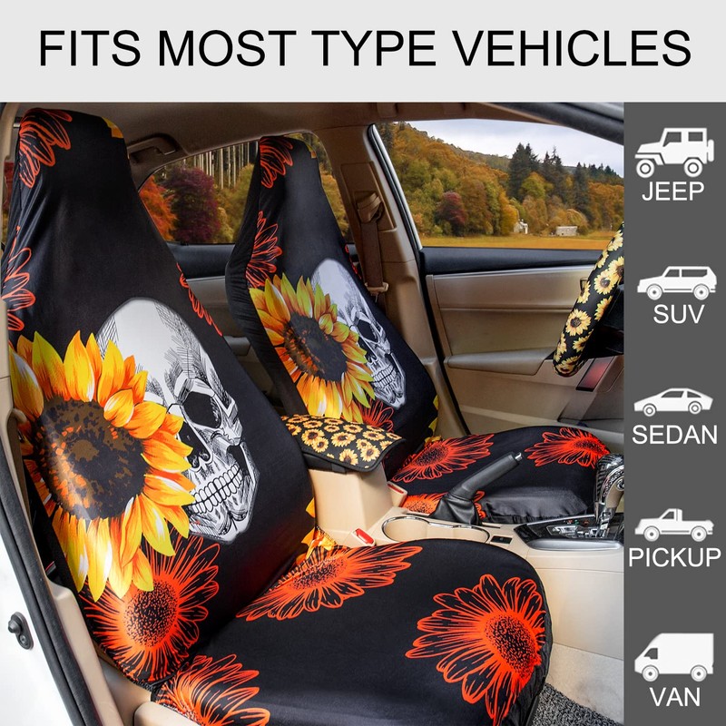 Evankin - Fundas de asiento delantero con estampado de girasol, 2 unidades, protector de asiento de coche, se adapta a la mayoría de coches, sedán, SUV, furgoneta y calavera de girasol