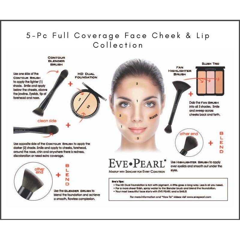 Achieving your most beautiful flawless face is fast and easy with EVE PEARL’s 5-Piece Full Coverage Collection. This collection is for you; If you want a foundation that can cover redness, discoloration, hyperpigmentation or acne prone skin. Ideal for sensitive skin, with no parabens and no fragrance. Results that look like YOUR skin, only better. You also get blush, Lipstick and 2 Professional brushes to complete the look. Note: For the best look the Blush Trio in the kit is created to match each complexion.