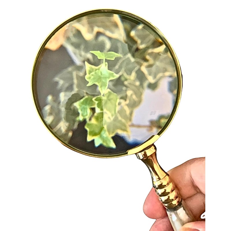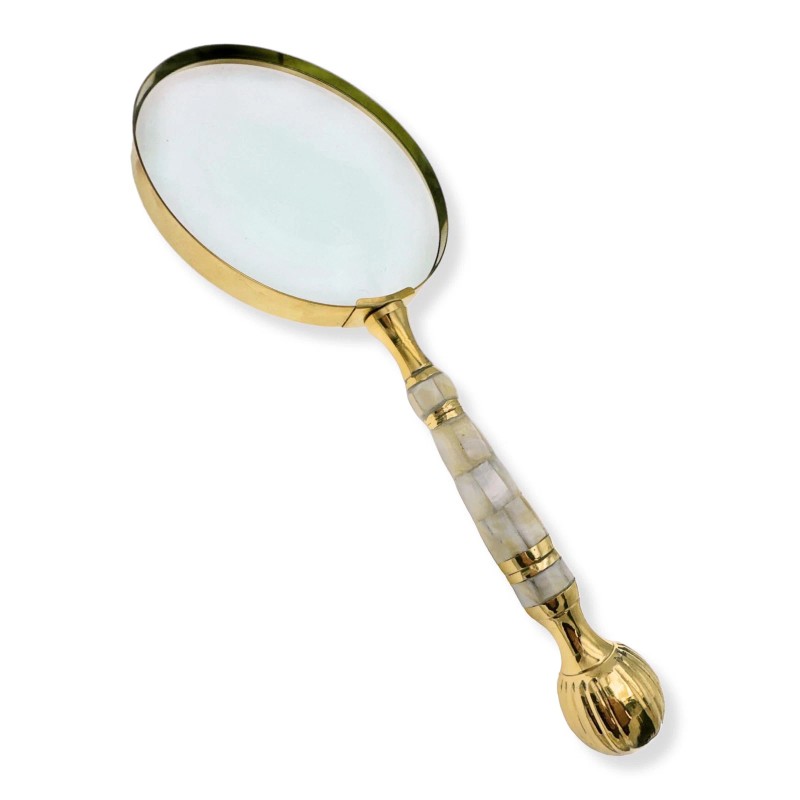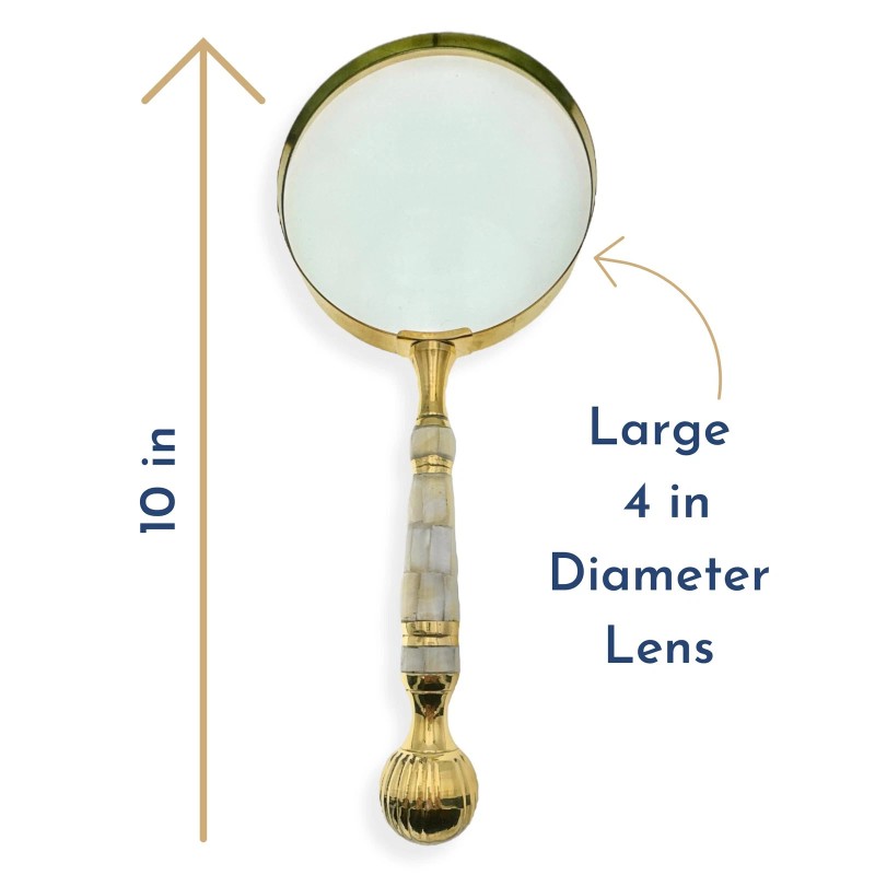 Introducing our exquisite handheld Magnifier, a true beauty that's designed to make everyday life easier. With an inlaid Mother of Pearl and Brass Handle, this magnifier is both eye-catching and functional. It has a substantial weight of 11 ounces, yet it fits comfortably in your hand, making it easy to maneuver.