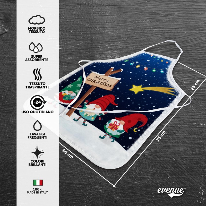 • High-quality product – The kitchen apron for men and women from evenue is designed and hand-printed in Italy with innovative technology that guarantees years of safe and bright colours. Suitable for everyday use and resistant to frequent washing in the washing machine. Unique and colourful illustrations for original and long-lasting Christmas gifts.
