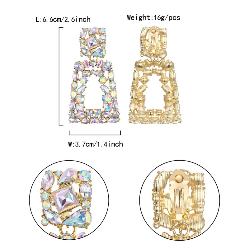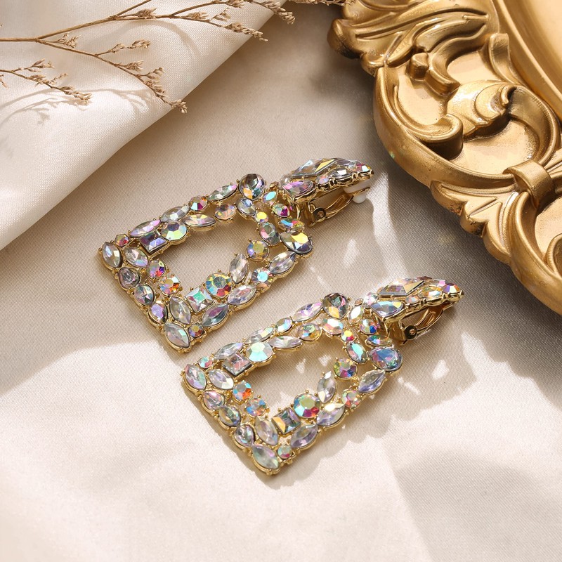 EVER FAITH Rectangle Clip-on Drop Earrings for Women, Sparkly Rhinestone Crystal Geometric Statement Non Pierced Earrings Iridescent Clear AB Gold-Tone