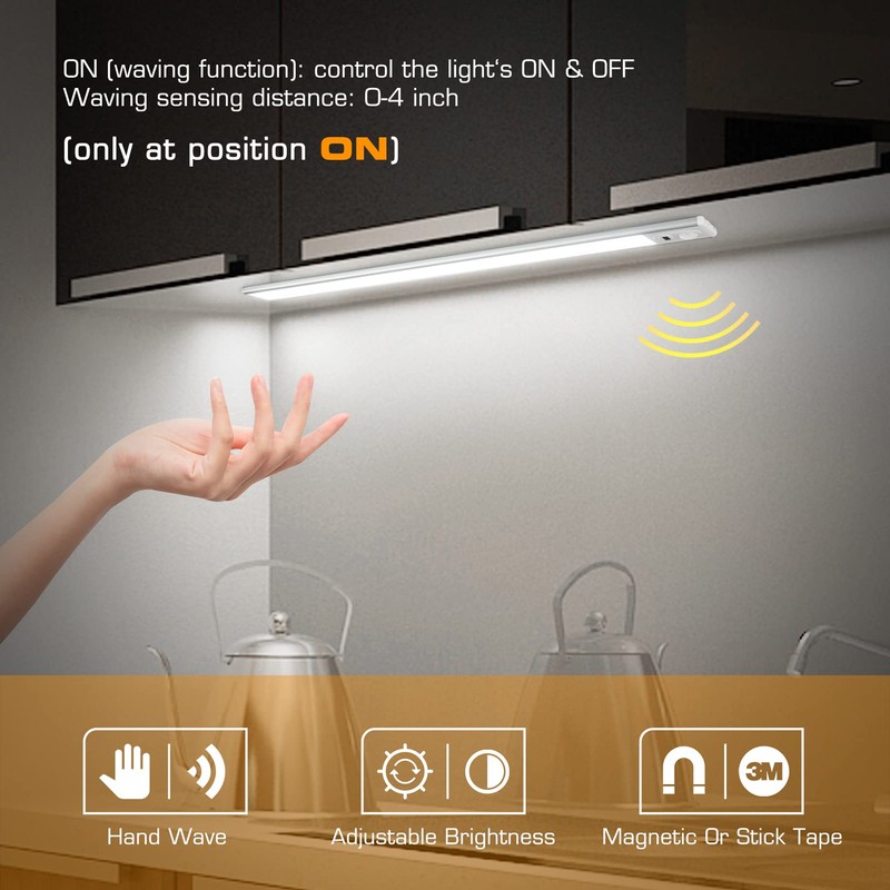- On Mode Only: Hand wave to turn on&off within 4"; Hold your hand under the sensor to adjust brightness within 4"; Will remember the last brightness setting before cutting the power off. (Under this Mode, no motion sensor function)