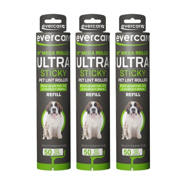 - COMPATIBLE WITH EVERCARE MEGA ROLLER: Fits Evercare’s 10-inch Mega Lint Roller (sold separately) to effortlessly refill when you are out of sheets. Includes three packs of 50 adhesive lint roller refill sheets for a total of 150 sheets.