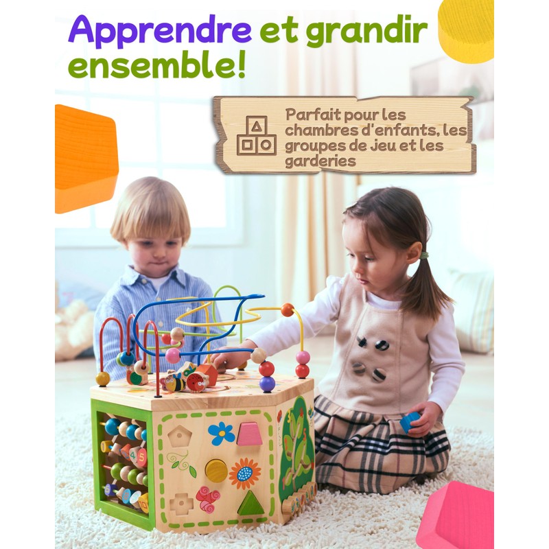 - 6 SIDES OF ACTIVITIES – This baby activity cube keeps child entertained with geometric shape sorting, counting beads, sliding animals, spinning gears and a wire bead maze on top!