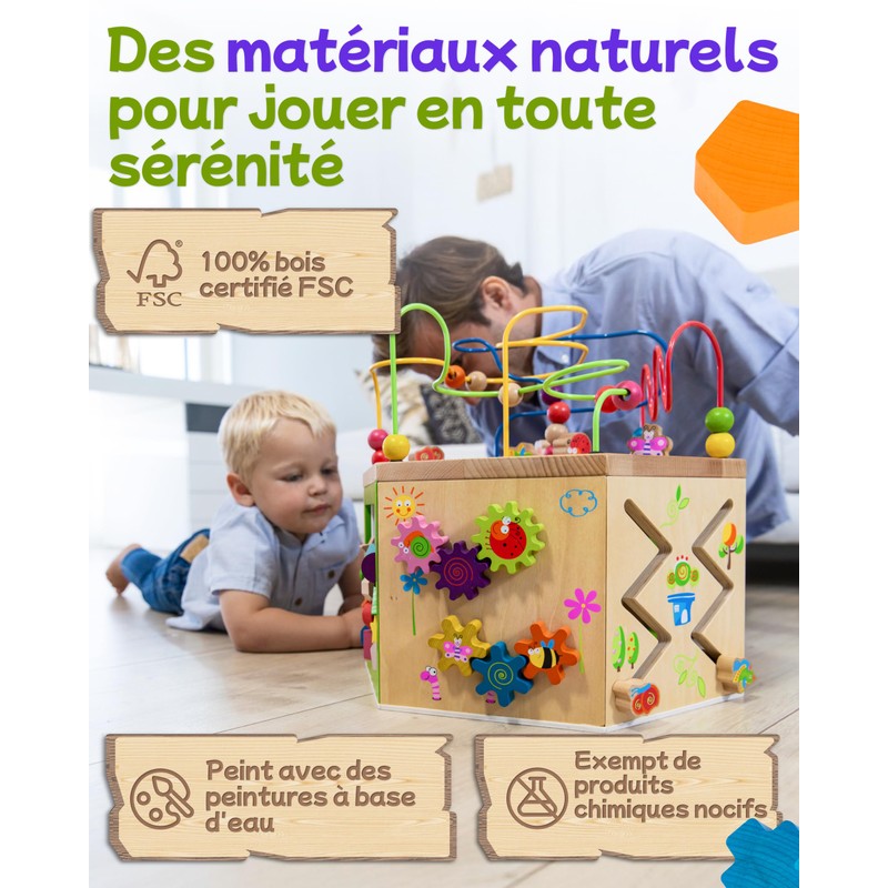 This item stands out above the rest by combining high quality craftsmanship, fine motor skill development, and playful graphics in an item that kids love to play with. Constructed primarily of rubberwood and painted with water color based paints, our cube is non-toxic and kid safe. Complete with six sides of activities to play with, from counting beads, spinning gears, magnetic shape sorter, peg maze, sliding pegs, and spinning shapes. And don’t forget the fun wire maze on top.