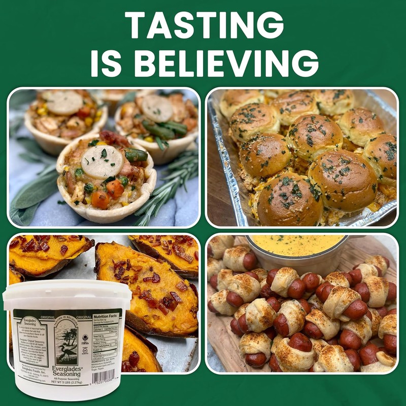5 Pound Bulk Tub- Everglades All Purpose Seasoning brings out the delicious flavor of steaks, hamburgers, chicken, potatoes, soups, eggs, vegetables, popcorn you name it.It's great on any food.Use before, during or after cooking. Use on your table to replace your salt and pepper.