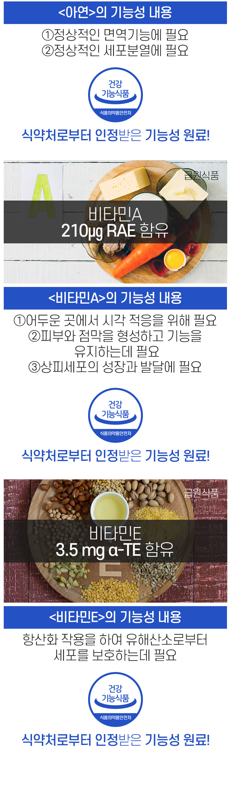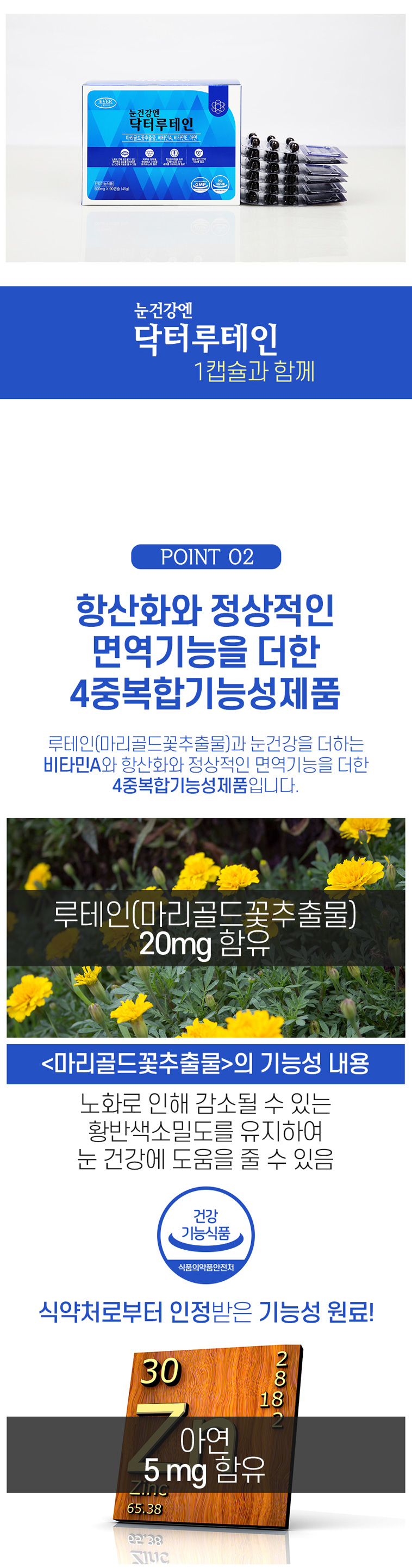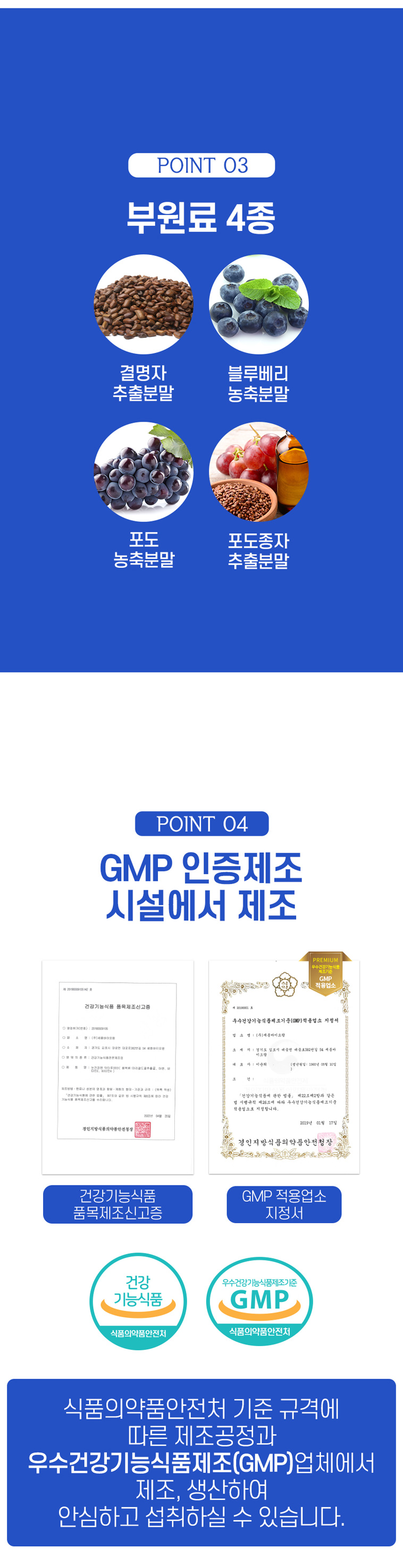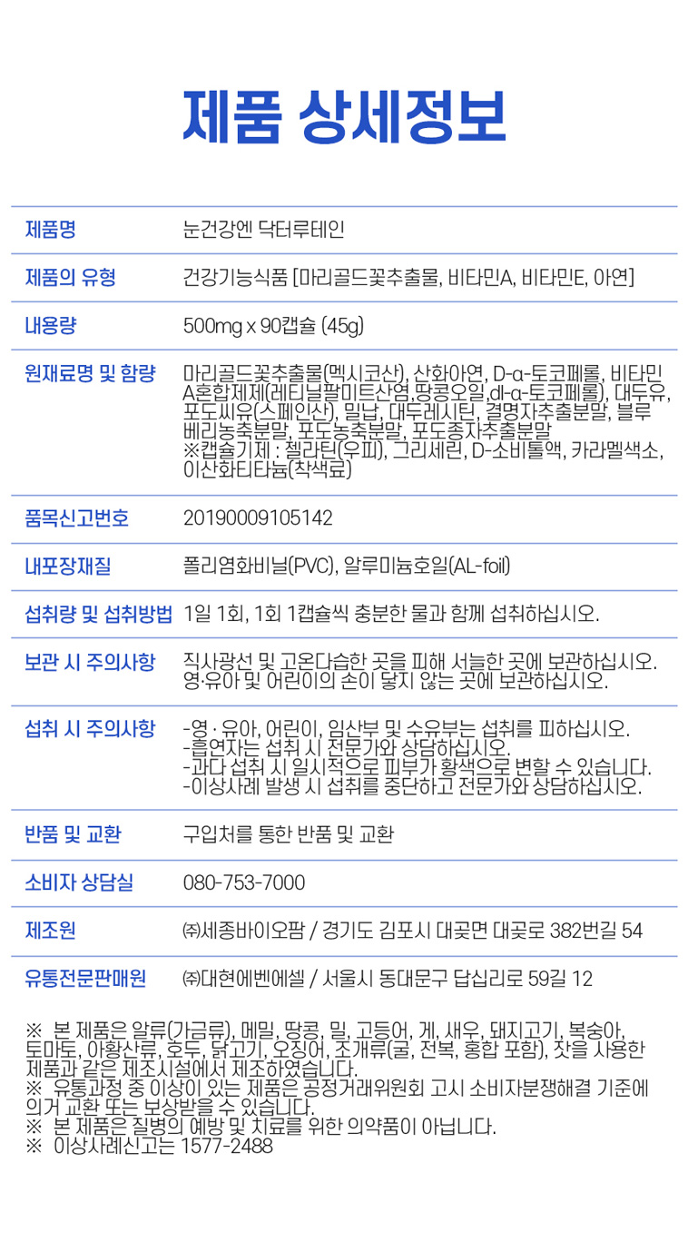 - 원(재)료명 및 함량: 마리골드꽃추출물(멕시코산),산화아연,D-a-토코페롤,비타민A혼합제제,대두유,포도씨유(스페인산),밀납,대두레시틴,결명자추출분말,블루베리농축분말,포도농축분말,포도종자추출분말