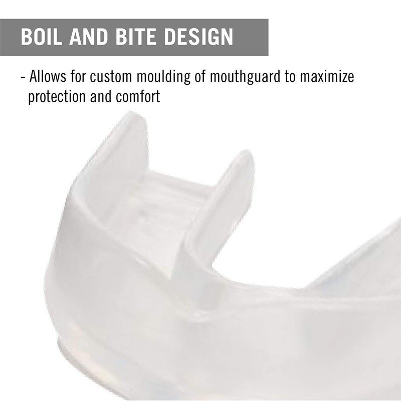 - Boil & bite down design allows for custom molding of mouth guard to maximize protection and comfort