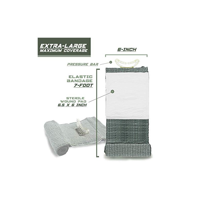 • Military Grade, Large Effective CoverageFor more wound coverage and security, the bandage is made with extra wide 6 inch non-adherent absorption pad, with over 7 foot elastic wrap unfolded.