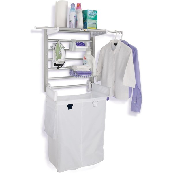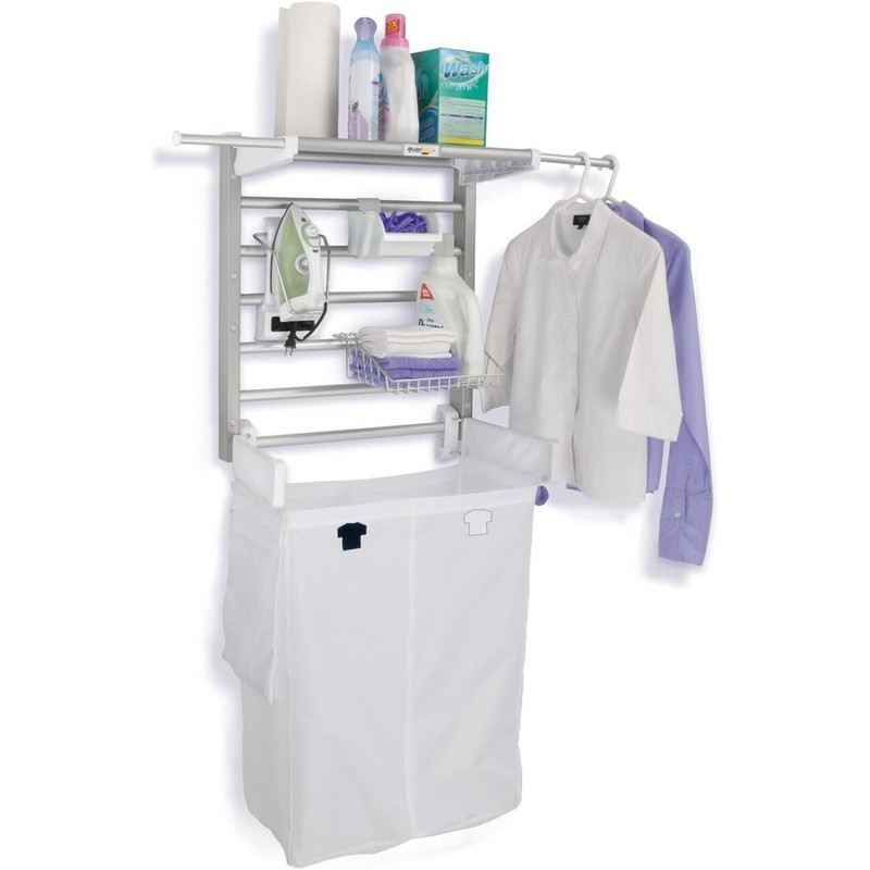 - Evertidy Laundry Organizer. SAVE BIG! Declutter your laundry room with this all-in-one center. Tired of having all your laundry stuff scattered all over the place? Put everything all in one place and get organized with the Evertidy Laundry Organizer. This system has an iron holder, a place to hang clothes, a laundry bag for delicates, storage bins and a hamper, all in one... it's like your laundry command center! Load it up: Made of aircraft-type aluminum, steel and fiberglass-reinforced polypropylene; Shelf with extendable rods; Iron holder; Laundry hamper with 2 compartments; Delicates wash bag; Basket; Utility bin; Ironing board wall holder; Anchors and screws for drywall installation and assembly instructions; Wall-mount system supports up to 150 lbs. 23 x 14 x 56' h., 12 lbs., 8 ozs. Laundry will be much less of a chore when you're organized with this Evertidy Laundry Organizer!