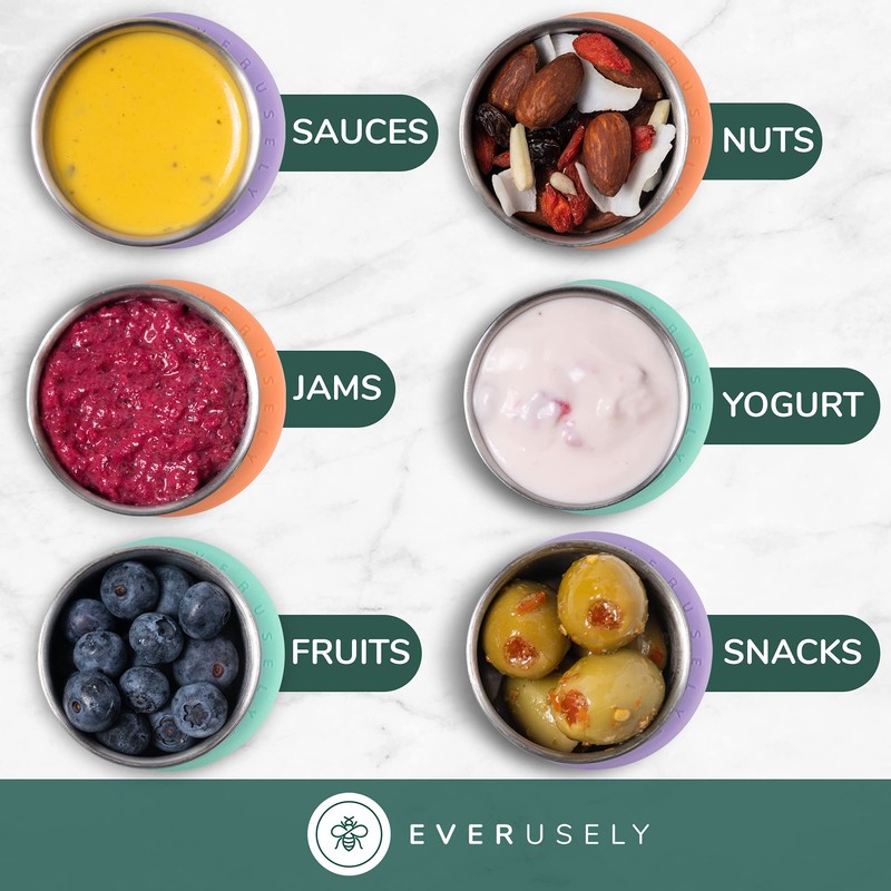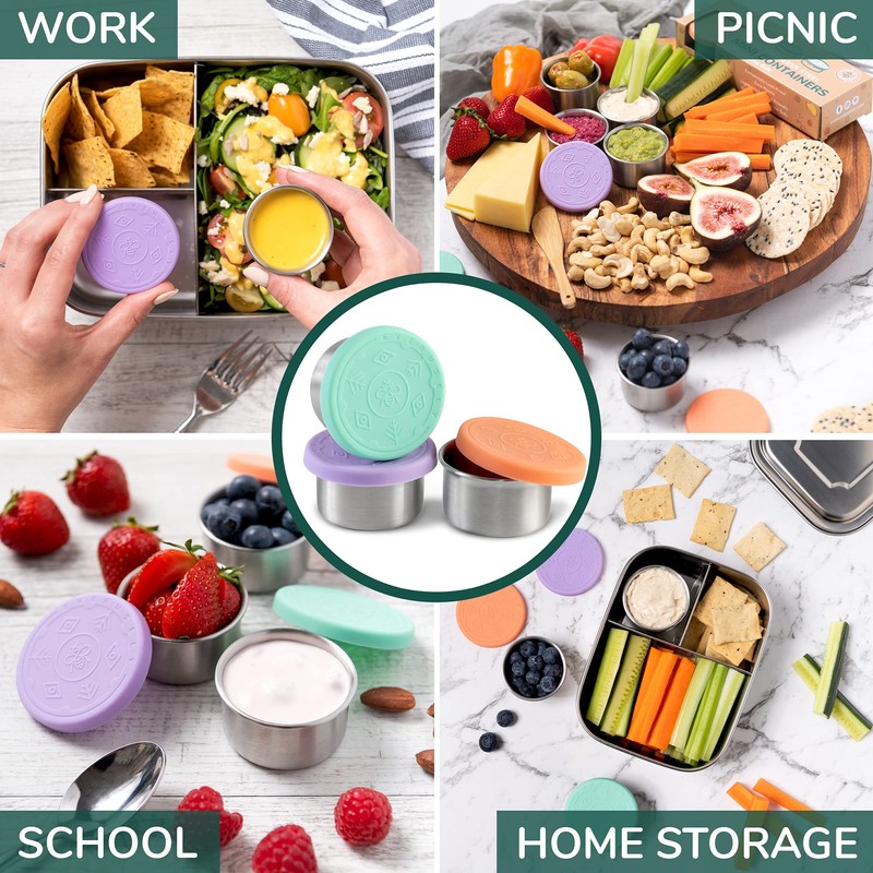 - 🍏 Completely Leakproof & Airtight: Take your sauce cups anywhere with confidence, or use them to keep food fresher for longer at home. The color-coded lids make them quick to identify & easy to remember what's inside. They are perfect to use with any Lunchbots stainless steel lunch container and great with bento lunch boxes for adults