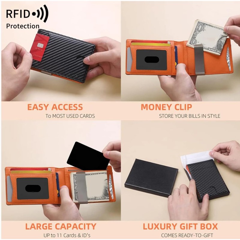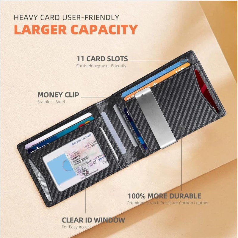 • Carbon Fiber Leather Finish: A stylish and modern carbon fiber leather look that adds a touch of sophistication to your wallet.