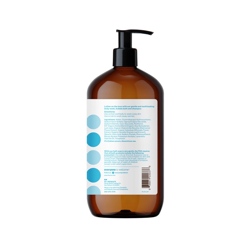 This is not your average soap. Everyone 3 in 1 Soaps combine gentle coconut cleansers, organic plant extracts, and vitamins E and B5 to nourish skin and hair while cleansing it of the day’s dirt and impurities. We know life gets crazy, that’s why our convenient 3-in-1 soaps work great as a shampoo, body wash, bubble bath, and even shave gel for a simplified routine. Plus, less bottles mean less plastic. At EO Products, we believe the best resources come from nature. That is why we are committed to our zero-waste mission. Our products are always made with reduction and repurposing in mind, this includes our recyclable packaging. Since 1995, we've made our products from domestic and imported ingredients in our family-owned and -operated factory in San Rafael, California. We learned early on that the only way to meet our own high standards was to take responsibility for everything ourselves. From our family to yours, enjoy.