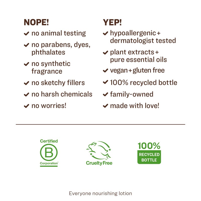 - Clean Promise: Everyone Nourishing Lotion is EWG verified, GMO free, cruelty free, gluten free, paraben free, triclosan free, and synthetic fragrance free