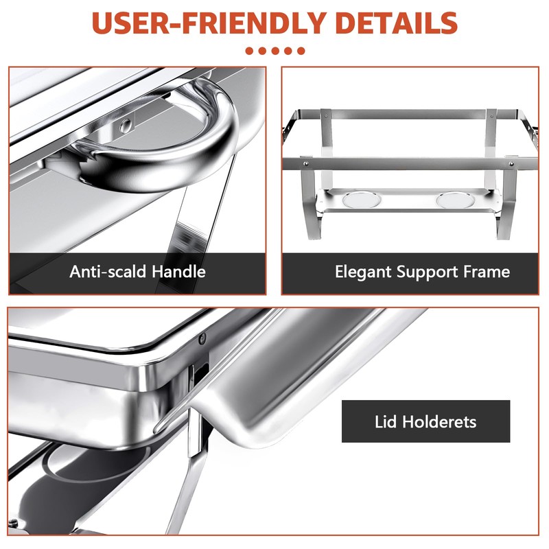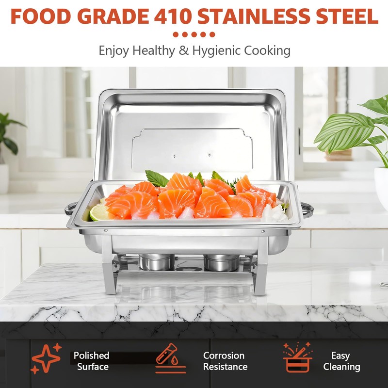 - Materials: The chafing dish buffet set is made from heavy-duty, food-grade stainless steel that resists rust, dents, and wear for lasting use. The rolled edges of stainless steel chafing dishes offer safe handling and help prevent accidental cuts during setup or service