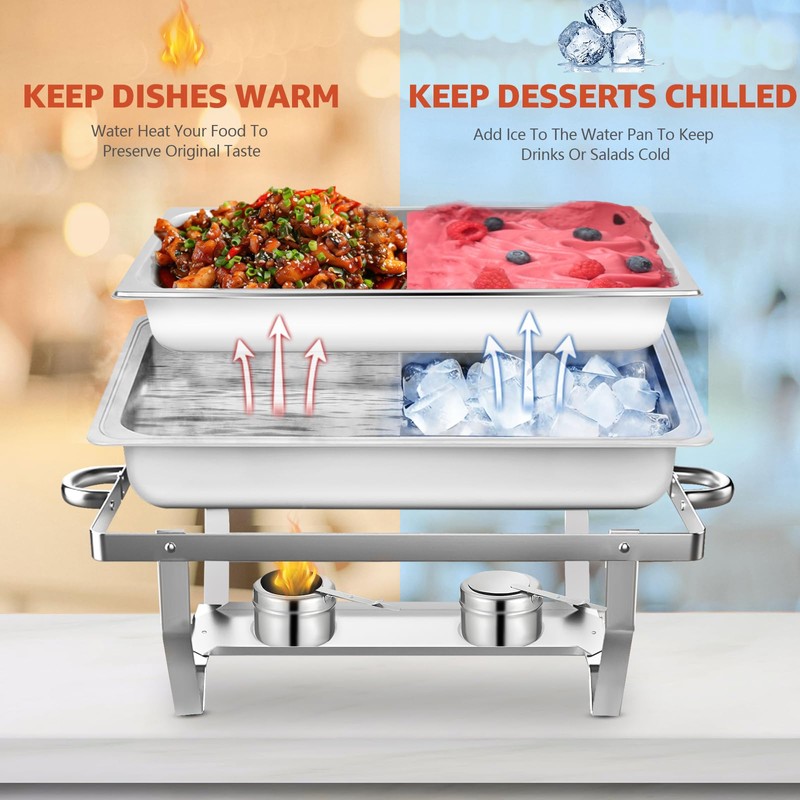- Function: The chafing dishes for buffet set of 5 includes both water pans and food pans that work together to keep food warm or chilled for hours. Preserve flavor, texture, and freshness with stable temperature control—suitable for any buffet or catering occasion