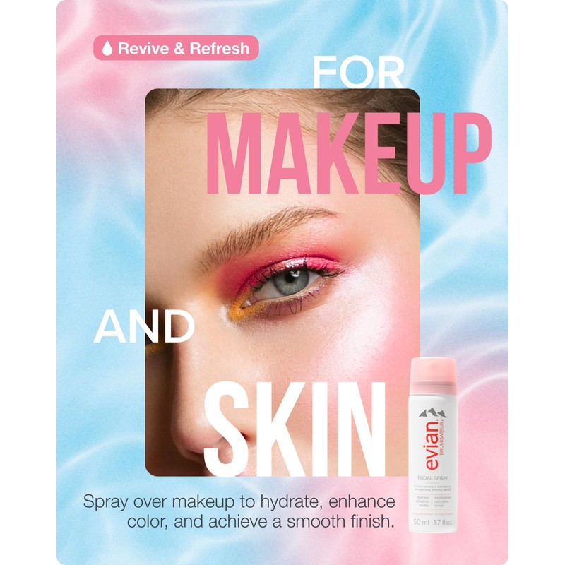 Explore the many uses of Evian Natural Mineral Water Facial Spray. Evian Facial Spray is the only facial spray that is sealed at the source with Evian water's unique mineral content, so you can be confident that it's completely pure. Propelled by ozone-friendly nitrogen, Evian Facial Spray's ultra-fine micro droplet mist delivers an unparalleled boost of natural hydration without using any harsh chemicals. Evian Facial Spray can be used to hydrate skin during your skincare routine, blend and set makeup, refresh skin throughout the day, and soothe sensitive skin.