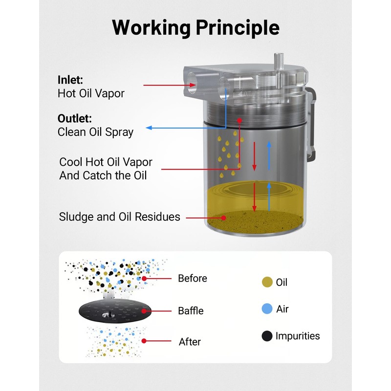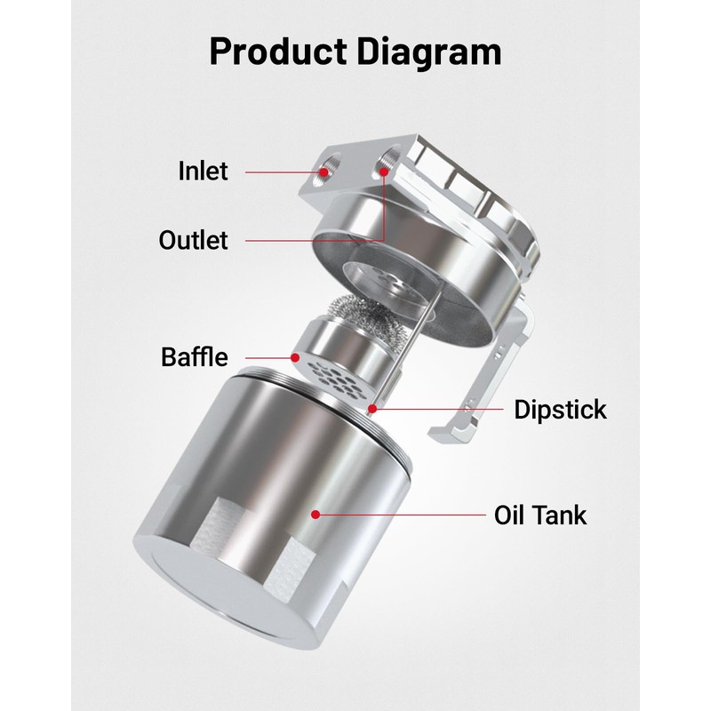 - Oil Catch Can with or without Breather Filter: Install the oil catch can with breather filter for pre-PCV cars as a vent system or without breather filter in line between PCV hoses as a seal can.