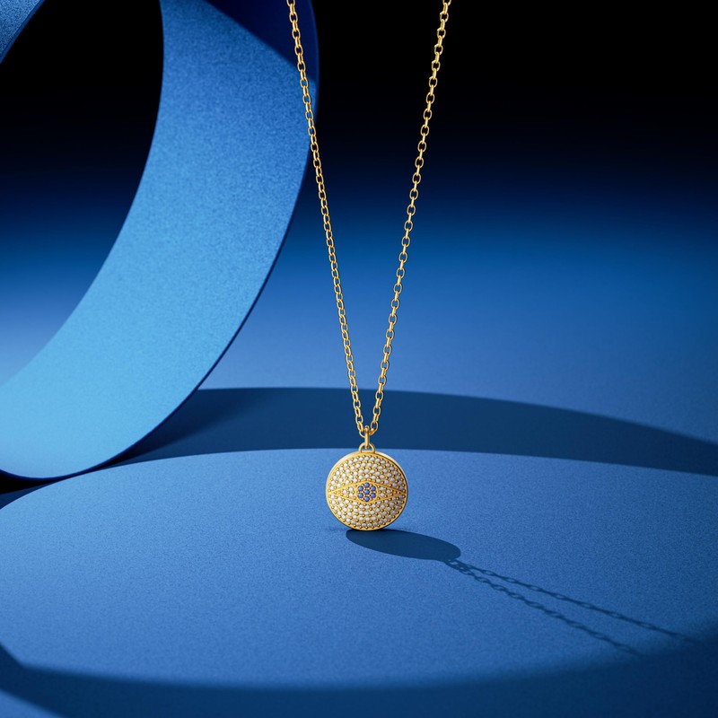 - DESIGN FEATURES: Elegant evil eye pendant with crystal accents and sunburst-inspired design, crafted in gold-tone finish for timeless appeal