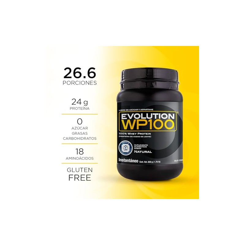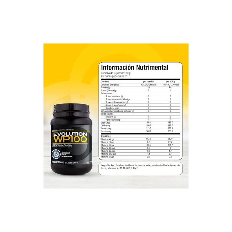 Acerca de este artículo PROTEÍNA DE SUERO DE LECHE. La proteína WP100 sabor Natural de Evolution, es una proteína aislada de suero de leche microfiltrada y ultrafiltrada. Contiene todos los aminoácidos esenciales y no esenciales, está enriquecida con 11 vitaminas y minerales CARACTERÍSTICAS. La fórmula especializada y exclusiva de Evolution es muy baja en sodio y es altamente soluble. No contiene carbohidratos ni grasas. Además, es libre de azúcar, aspartame y gluten USO RECOMENDADO. Se recomienda tomarla diluida en 350 ml de agua o leche, después del ejercicio. Si se consume antes de la actividad física, debe de ir acompañada de alguna fuente de carbohidratos. Brinda 26.6 porciones por bote, un mes consumiéndolo por 5 días a la semana CERTIFICACIONES. Contamos con certificaciones nacionales e internacionales. Esta proteína es Keto Friendly. Este producto no es un medicamento. El consumo de este producto es responsabilidad de quien lo recomienda y de quien lo usa NUEVA IMAGEN EVOLUTION. Seguimos evolucionando para tu bienestar. Por ello, decidimos rediseñar nuestra imagen. Es posible que en tu próximo pedido recibas el producto con la imagen anterior, o mejor aún, con nuestra nueva imagen y la calidad de siempre EVOLUTION. Es una empresa mexicana con más de 10 años de experiencia en el mercado de nutrición deportiva y wellness. Gracias a su determinación, certificaciones, compromiso y visión, se ha posicionado como una de las líneas más completas de suplementos alimenticios en el mercado mexicano