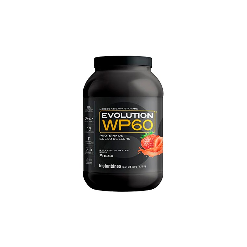 Acerca de este artículo PROTEÍNA DE SUERO DE LECHE. La proteína WP60 sabor Fresa de Evolution, es una mezcla de proteína concentrada y ultrafiltrada de suero de leche. Contiene todos los aminoácidos, tanto los esenciales como los no esenciales, vitaminas y minerales CARACTERÍSTICAS. La fórmula especializada y exclusiva de Evolution es muy baja en sodio y es altamente soluble. Está hecha de colorantes y saborizantes naturales a base de jugo de frutas y/o verduras. Sin azúcar añadida USO RECOMENDADO. Se recomienda tomarla diluida en 350 ml de agua o leche, después del ejercicio. Ideal para tomarse después del entrenamiento, ya que ayuda a la recuperación post ejercicio. Brinda 18 g de proteína y 7.5 g de hidratos de carbono por porción CERTIFICACIONES. Contamos con certificaciones nacionales e internacionales. Este producto no es un medicamento. El consumo de este producto es responsabilidad de quien lo recomienda y de quien lo usa. No se recomienda tomarla durante el embarazo y lactancia EVOLUTION. Es una empresa mexicana con más de 10 años de experiencia en el mercado de nutrición deportiva y wellness. Gracias a su determinación, certificaciones, compromiso y visión, se ha posicionado como una de las líneas más completas de suplementos alimenticios en el mercado mexicano