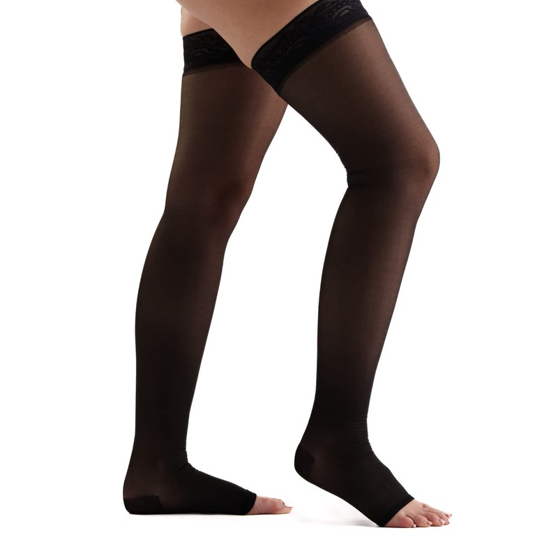 • COMFORTABLE ALL-DAY WEAR: The women’s compression stockings have an open toe design and a premium, stay up top band that leaves no marks. The discreet, stylish sheer fabric design is great for walking, sitting, standing, travel, and for all attire.