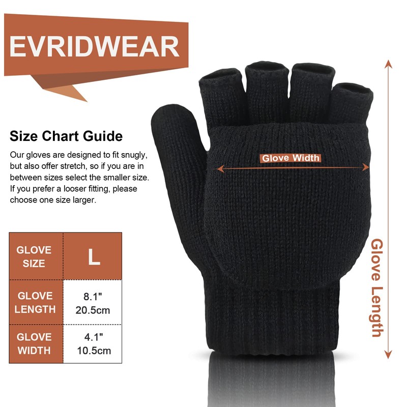 Evridwear Fingerless Winter Gloves Convertible, Knitted Wool Flip-top Mittens, Anti-Slip Suede Leather & Upgraded Closure, Unisex Black with Magnet/L