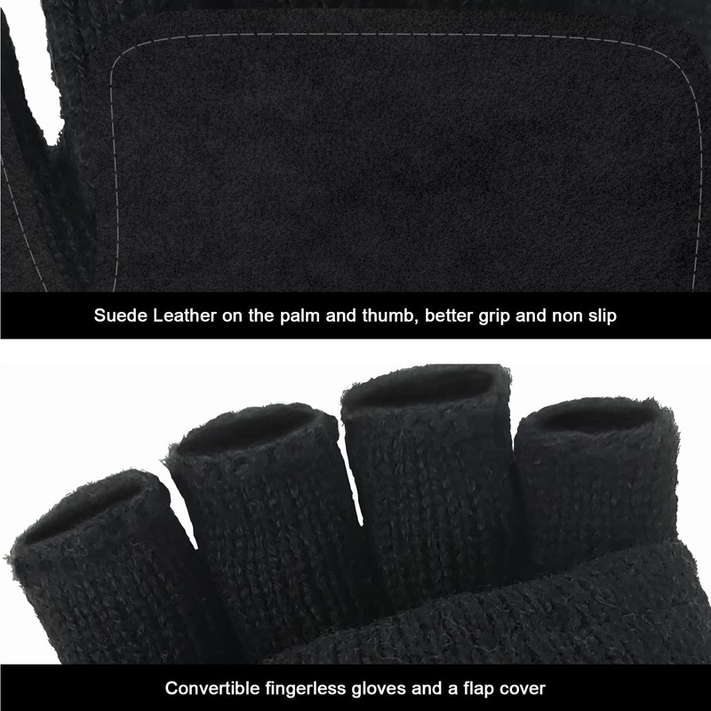 - Convenient design: Our mitten gloves have a hook and loop closure on the fingertip side which is very convenient to get your fingers free to do something or put the flap cover over to keep warm with a piece of velcro on the back. There is a piece of wearable suede leather on the palm and thumb, it is nonslip when you trying to grab a pen or bottle or using a cellphone