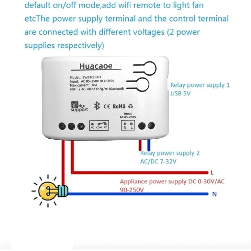 - Easy to set up: Use low-voltage USB 5V or AC 85-250V, only 2.4G wifi is supported.The relay switch also supports Bluetooth.Once it's on,turn on Bluetooth and connect, then tap to configure the Smart Life app directly.When the network is disconnected, it can be controlled from a close distance via Bluetooth.