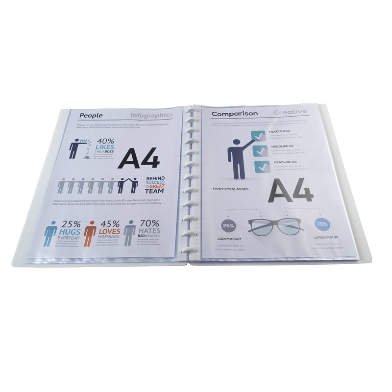 • Made from a semi-rigid opaque PP with white plastic spiral binding.