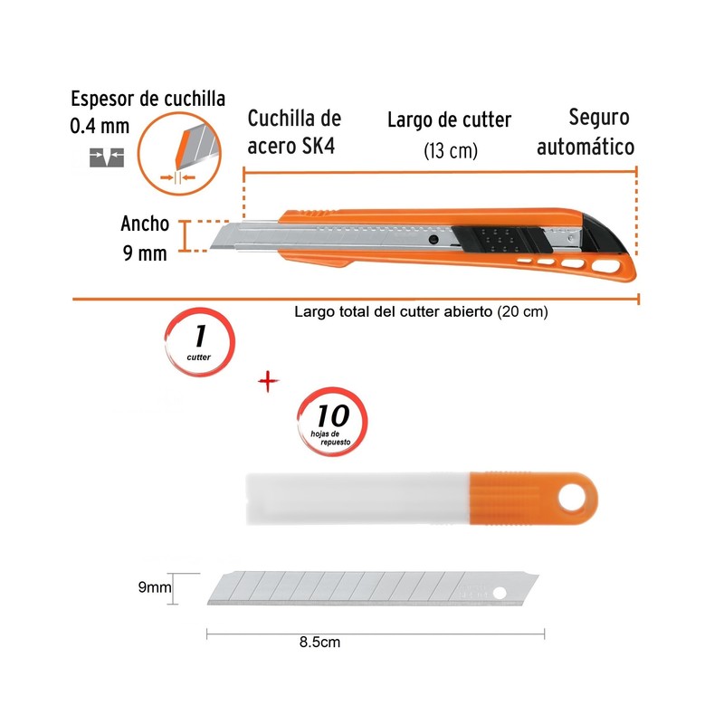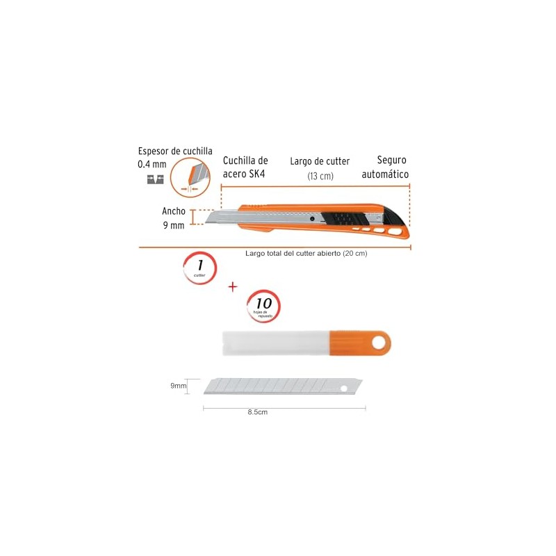 - Para trabajo exacto diseño retráctil de su cuchilla 9mm podrás cortar con precisión gracias a su navaja 0.4mm de grosor desde papel hasta Vinil. Alma metálica, cuerpo plástico, soporte ergonomico, diseño autolock bloqueo automático, incluye caja con 10 Navajas 9mm Fabricada en acero SK4, bisel para cortes más precisos 0.4 mm