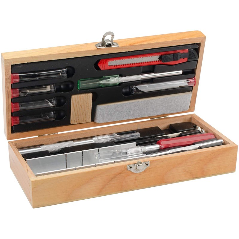 - Includes knives, awl, ,miter box, screwdrivers, sanding block and much more