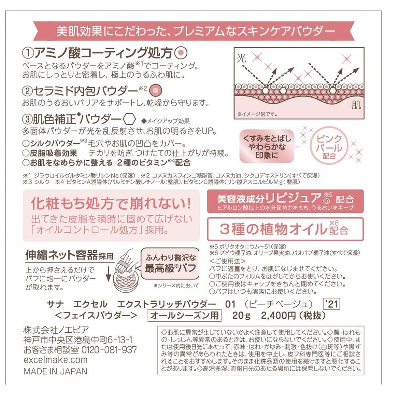 Excel Extra Rich Powder 01 '21 Foundation, Peach Beige, 0.7 oz (20 g)