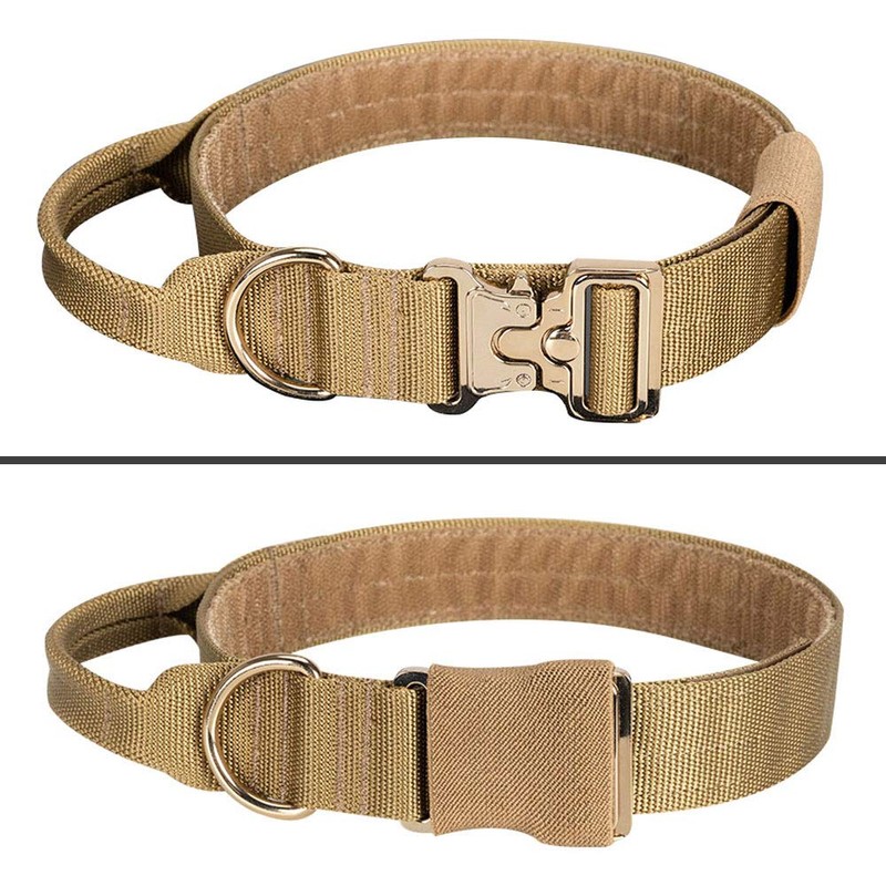 - Design of the Handle. This heavy duty dog collars has a control handle can grab your dog, makes it very easy when putting your dog in walking him to your side for a firm and secure grip. The width is 1.5" dog tactical collar fit for medium large Dogs,used for boy and girl dogs,police military golden retriever alaska, akita, and german shepherd.etc.