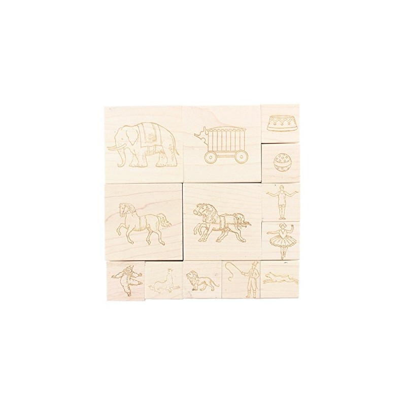 - 13-piece stamp set includes: elephant (2" x 2"), carriage (2" x 2"), podium (1" x 1"), ball (1" x 1"), horse (2" x 2"), double horse (2" x 2"), acrobat (1" x 1"), ballerina (1" x 1"), clown (1" x 1"), seal (1" x 1"), lion (1" x 1"), lion tamer (1" x 1"), and dog (1" x 1")