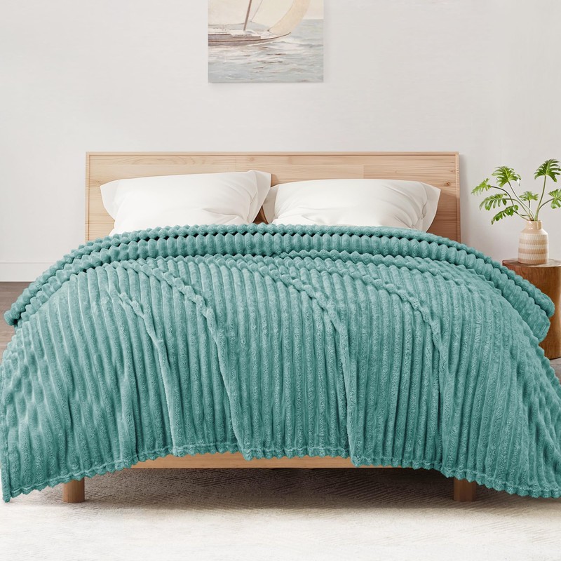 Exclusivo Mezcla Queen Size Flannel Fleece Blanket, Super Soft Striped Jacquard Bed Blanket, Lightweight Fuzzy Cozy for All Seasons, 90x90 Inches, Celadon