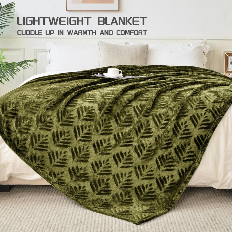 Exclusivo Mezcla Twin Size Fleece Blanket for Bed, Super Soft and Cozy Blankets All Season Use, Leaves Pattern, Plush Fuzzy Lightweight, Olive Green, 60x80 Inch