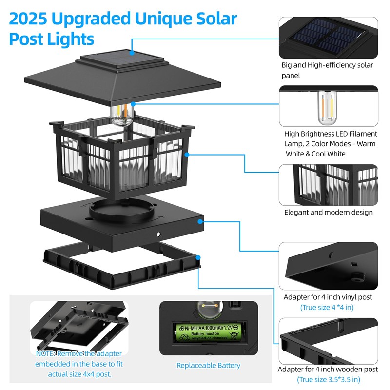 - ELEGANT & FUNCTIONAL DESIGN - Upgrade your outdoor space with these modern solar post cap lights, featuring clear ribbed panels that diffuse light beautifully while showcasing a stylish Edison-style bulb. The sleek black frame adds a contemporary touch, blending classic and modern aesthetics. Perfect for decks, fences, and garden posts, these lights create a warm, inviting ambiance.