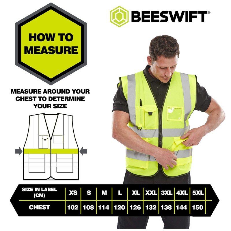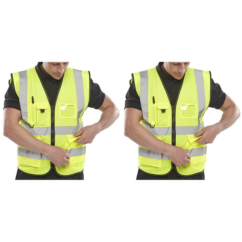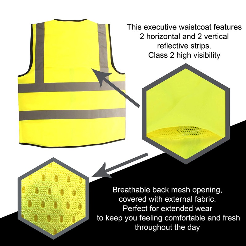 • The Hi-Vis Executive Vests are all made of 100% Polyester whilst still meeting the EN ISO 20471 Class 2 High Visibility.