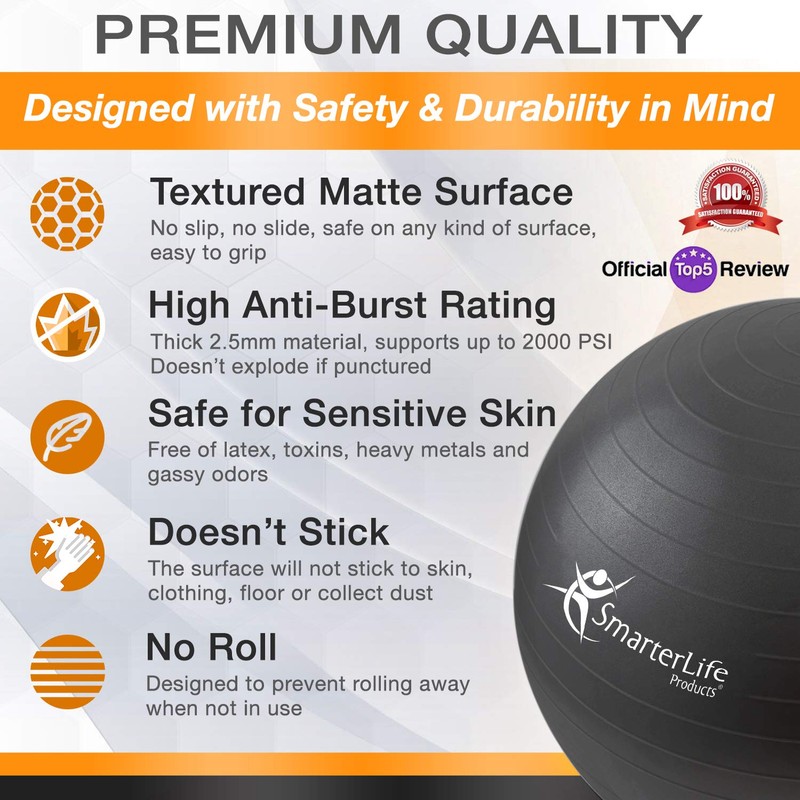 - Additional Information: The SmarterLife Exercise Ball is a premium quality product and incorporates extra thick PVC material for safety and durability. Please note that the extra thick material may create resistance during the initial inflation. Don't give up, trust the instructions and measuring tape. It's worth it!