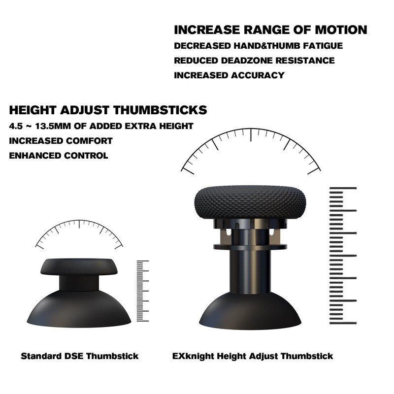 • MORE OPTIONS: Additional heights added compare to standard PS5 Edge controller sticks for better adaptation. The additional heights include: Low Rise(4.5-5.5MM); Mid Rise(6.5-7.5-8.5-9.5MM); High Rise(10.5-11.5-12.5-13.5MM)
