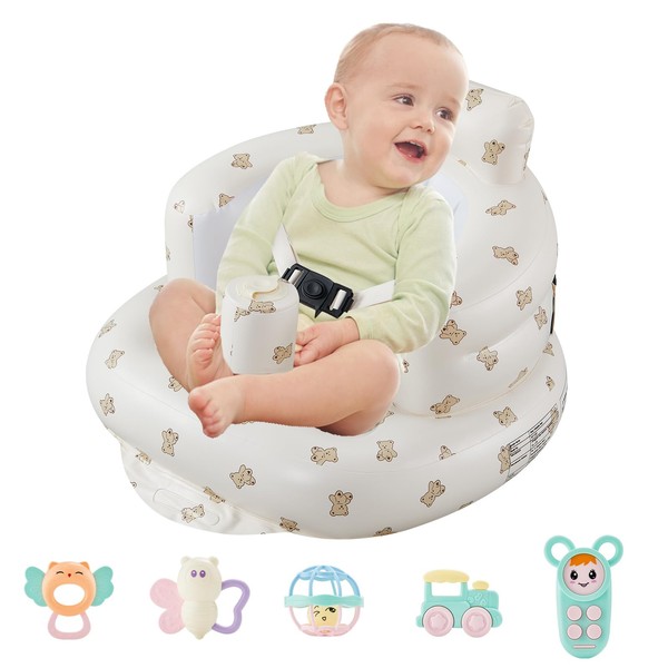 - All-around Training:Inflatable infant seat can be used as a baby sitting training tool, can be used for bath, dinner, story time, or as a baby inflatable beach chair or camping chair. Infant shake rattle can exercise baby's hands and can also be used as a soothing tool. It is the perfect gift set for your baby.