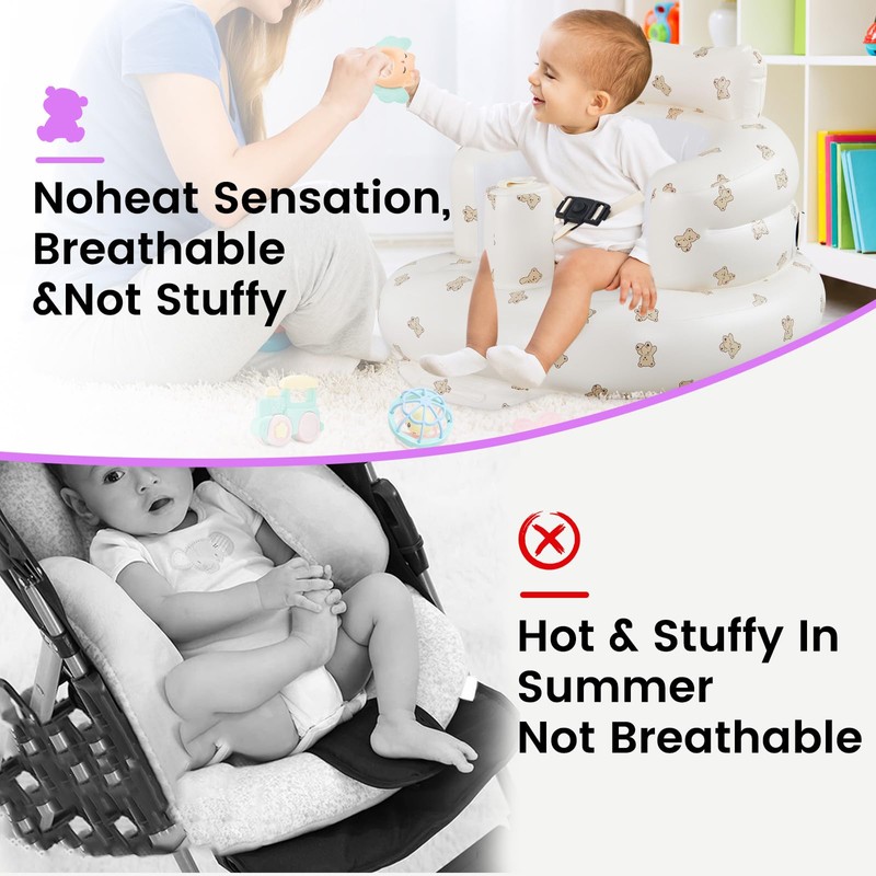 - Easy to Use and Portable:By pressing up and down the built-in air pump that comes with it, baby inflatable seat can be inflated in 2 minutes and can provide a seat for your baby anytime, anywhere. Small size after deflating and folding, easy to carry. Bottom leakage hole design, breathable and not stuffy, suitable for a variety of places such as the floor, beach, grass.