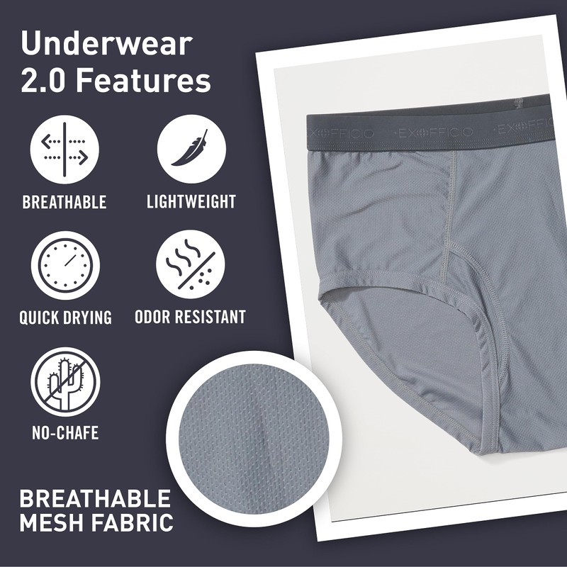 - Breathable Design - The perfect underwear for travel, the ExOfficio Men's Give-N-Go 2.0 Brief is made with a breathable mesh fabric that supplies airflow to keep you cool on the beach, plane, or road tripping car