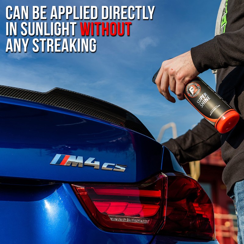 - Can Be Applied In Direct Sunlight - Super Shine can be applied in almost ANY condition. It can be applied in direct sunlight, in high temperatures with humidity and it will not streak. It also works on top of any wax, sealant or coating!